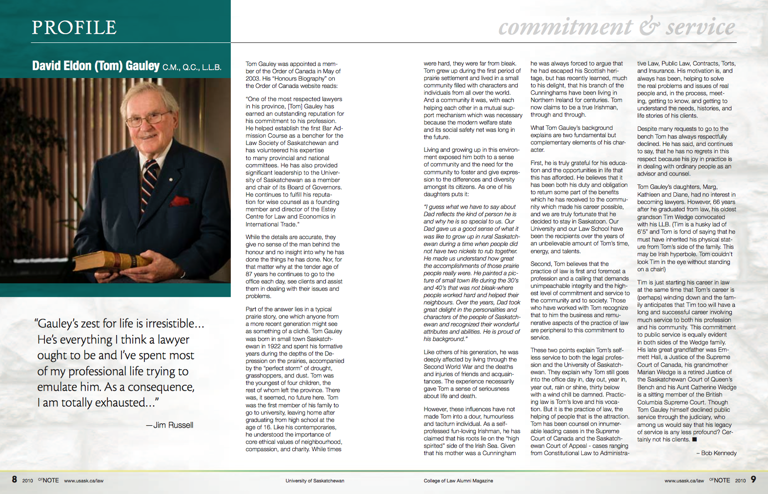 David Eldon (Tom) Gauley, CM, QC, (LLB’43) passed away peacefully on May 4, 2016. The following story about Tom written by Bob Kennedy was featured in the 2010 issue of of NOTE.