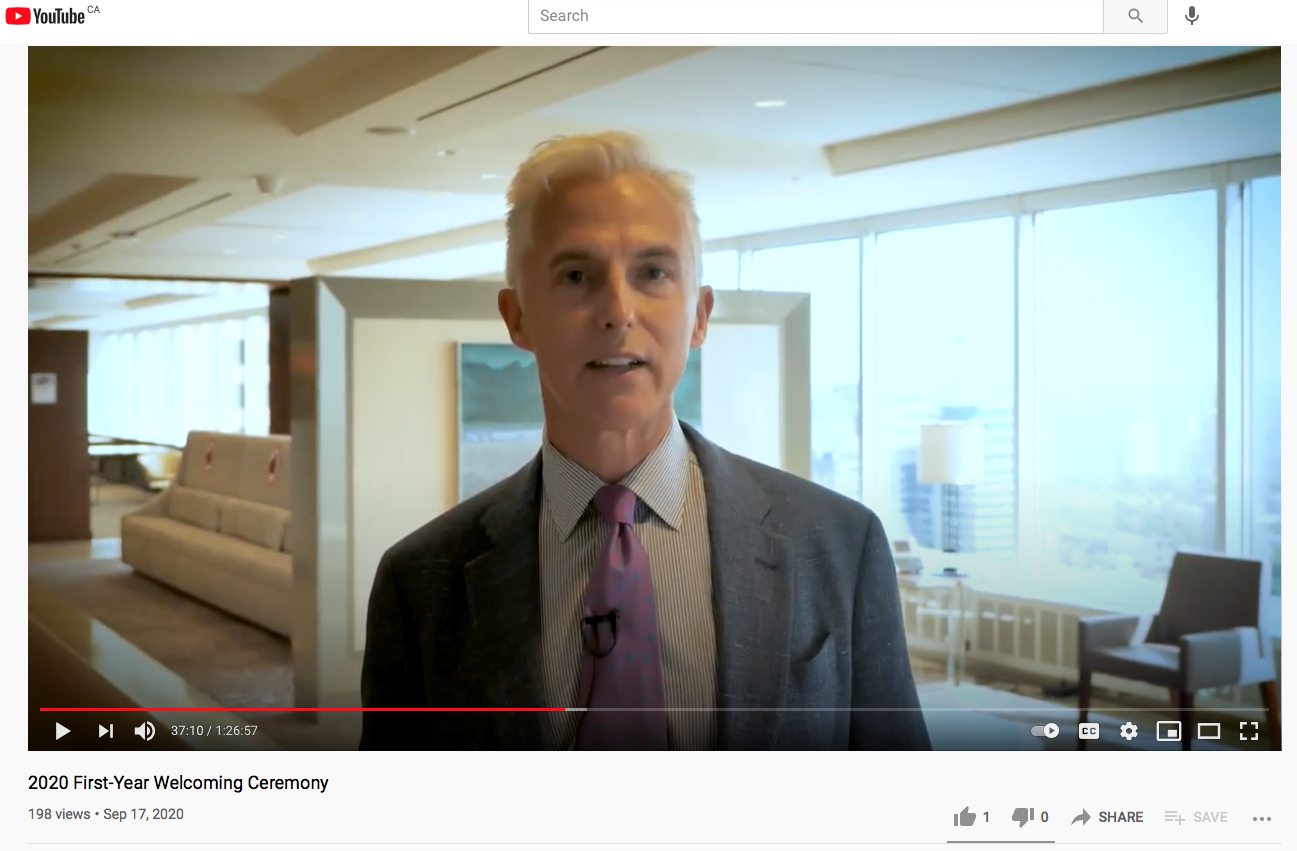 The event was designed to include a combination of pre-recorded and live remarks. The dean hosted the event live from Convocation Hall—the usual setting for the ceremony—while representatives from the judiciary, legal organizations and Burnet Duckworth and Palmer LLP (sponsors of the event), addressed students and their families.