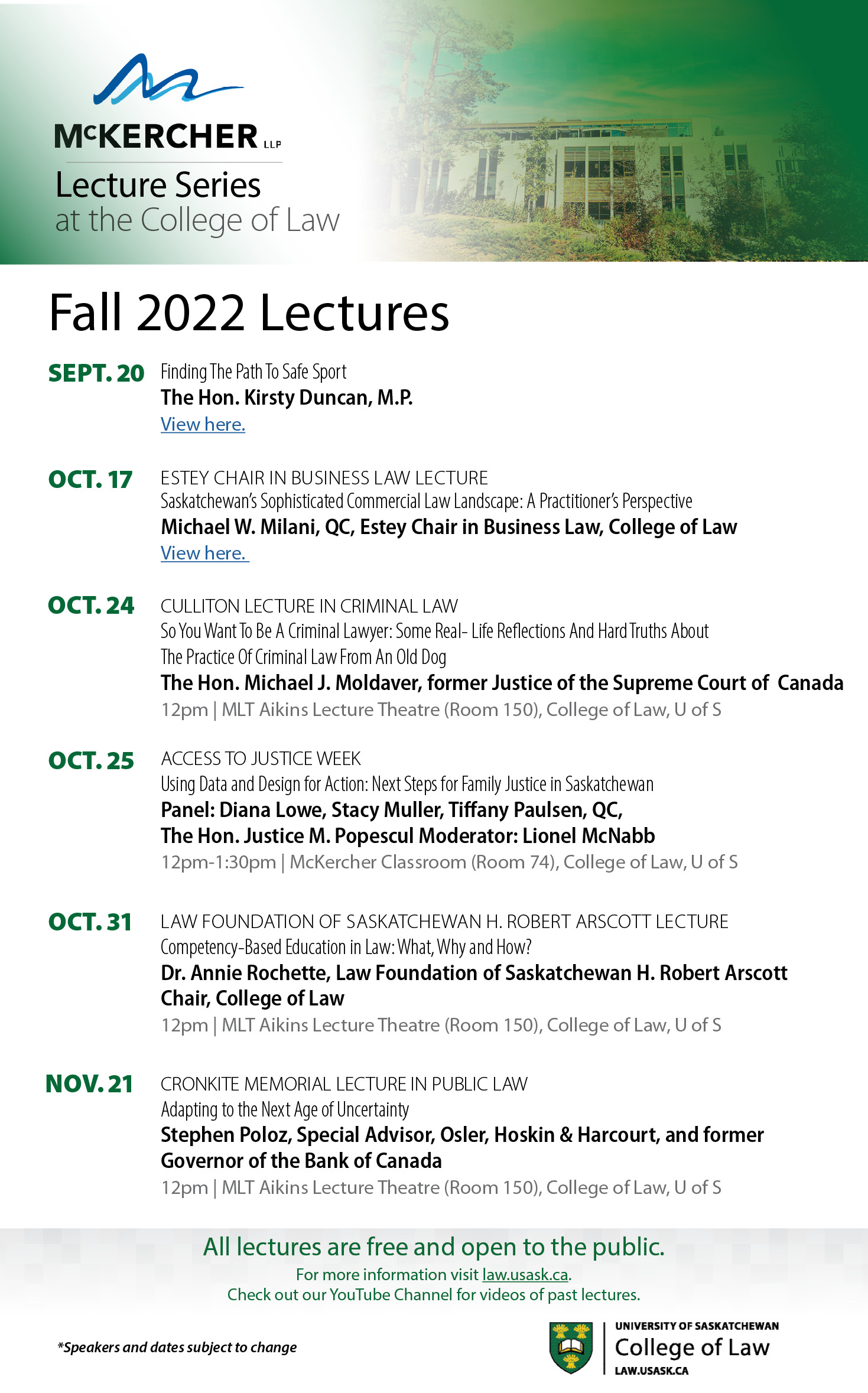 The McKercher Lecture Series at the College of Law kicks off on Sept. 20 with The Hon. Kirsty Duncan, MP, Member of Parliament for Etobicoke North, ON. This lecture is entitled Finding the Path to Safe Sport. All lectures are free and open to the public. They will also be livestreamed at law.usask.ca should you not wish to attend in person.